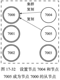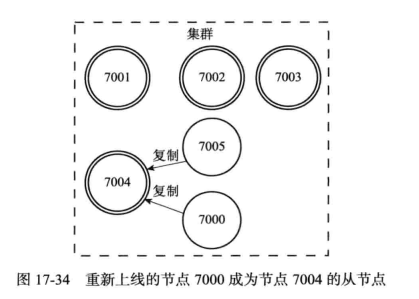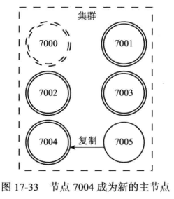 如果这时,节点7000进入下线状态,那么集群中仍在正常运作的几个主节点将在节点7000的两个从节点——节点7004和节点7005中选出一个节点作为新的主节点,这个新的主节点将接管原来节点7000负责处理的槽,并继续处理客户端发送的命令请求。