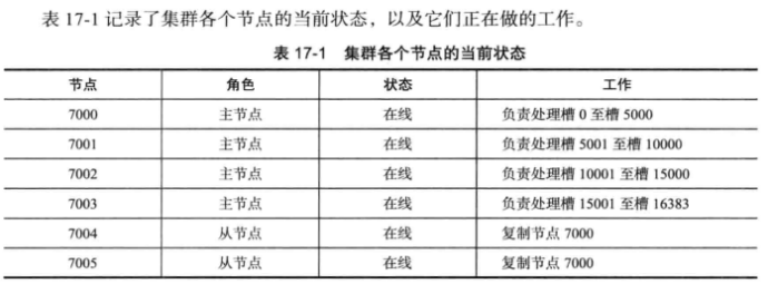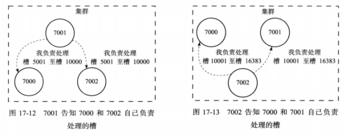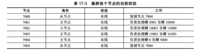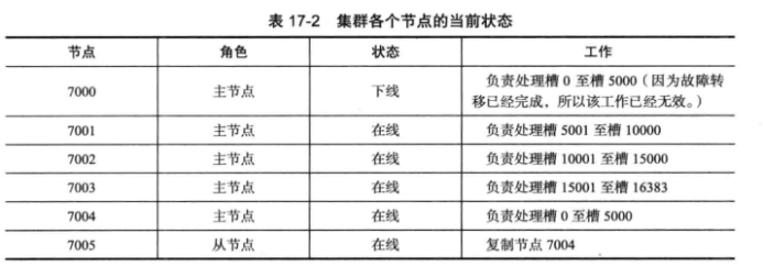 当数据库中的16384个槽都有节点在处理时,集群处于上线状态(ok );相反地,如果数据库中有任何一个槽没有得到处理,那么集群处于下线状态( fail )。