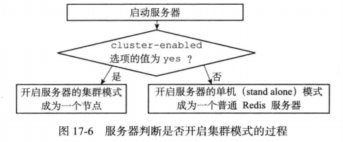 一个节点就是一个运行在集群模式下的Redis服务器,Redis服务器在启动时会根据cluster-enabled配置选项是否为yes来决定是否开启服务器的集群模式,如图17-6所示。