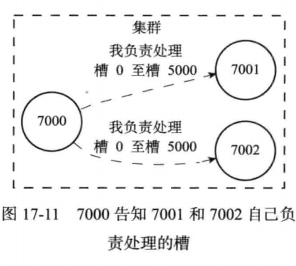 一个节点除了会将自己负责处理的槽记录在clusterNode结构的slots属性和numslots属性之外,它还会将自己的slots数组通过消息发送给集群中的其他节点,以此来告知其他节点自己目前负责处理哪些槽。