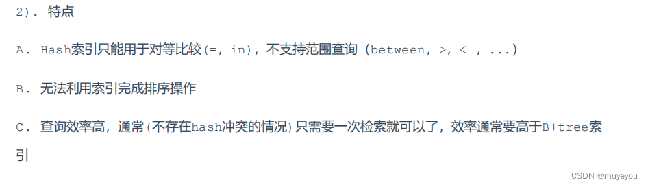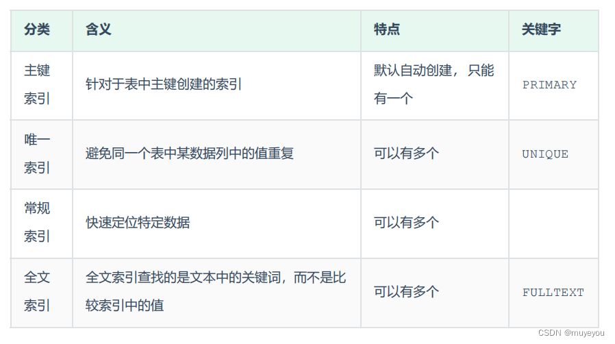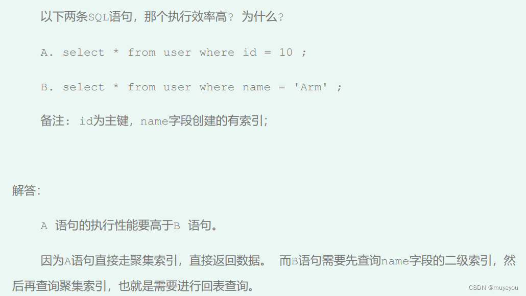 #查看当前表所包含的索引 show index from tb_user; #name字段为姓名字段,该字段的值可能会重复,为该字段创建索引。 create index idx_user_name on tb_user(name); #phone手机号字段的值,是非空,且唯一的,为该字段创建唯一索引。 create unique index idx_user_phone on tb_user(phone); #为profession、age、status创建联合索引。 create index idx_user_pro_age_sta on tb_user(profession,age,status); #为email建立合适的索引来提升查询效率。 create index idx_user_email on tb_user(email); #删除索引 drop index idx_user_email on tb_user;