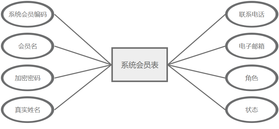 系统会员管理主要属性包括:系统会员编码、会员名、加密密码、真实姓名、联系电话、电子邮箱、角色、状态。