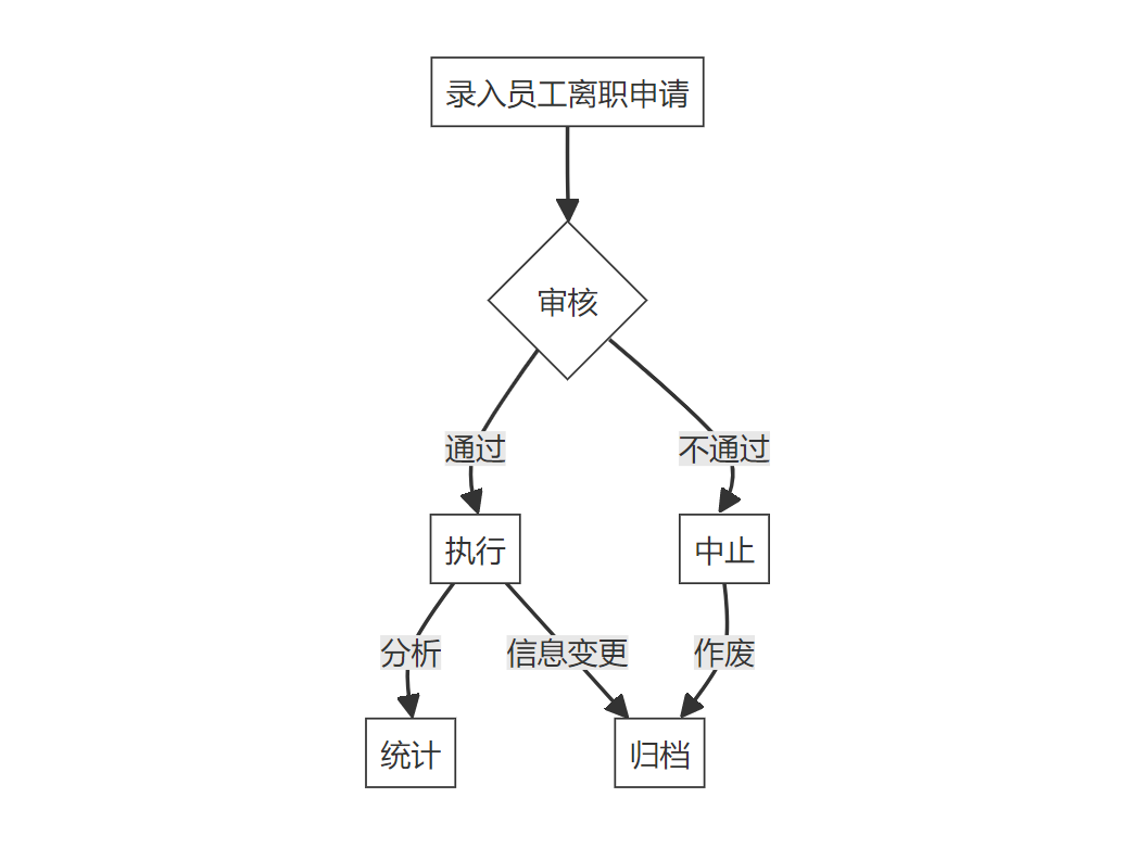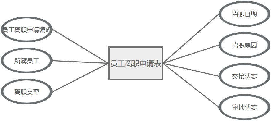 员工离职申请管理主要属性包括:员工离职申请编码、所属员工、离职类型、离职日期、离职原因、交接状态、审批状态。
