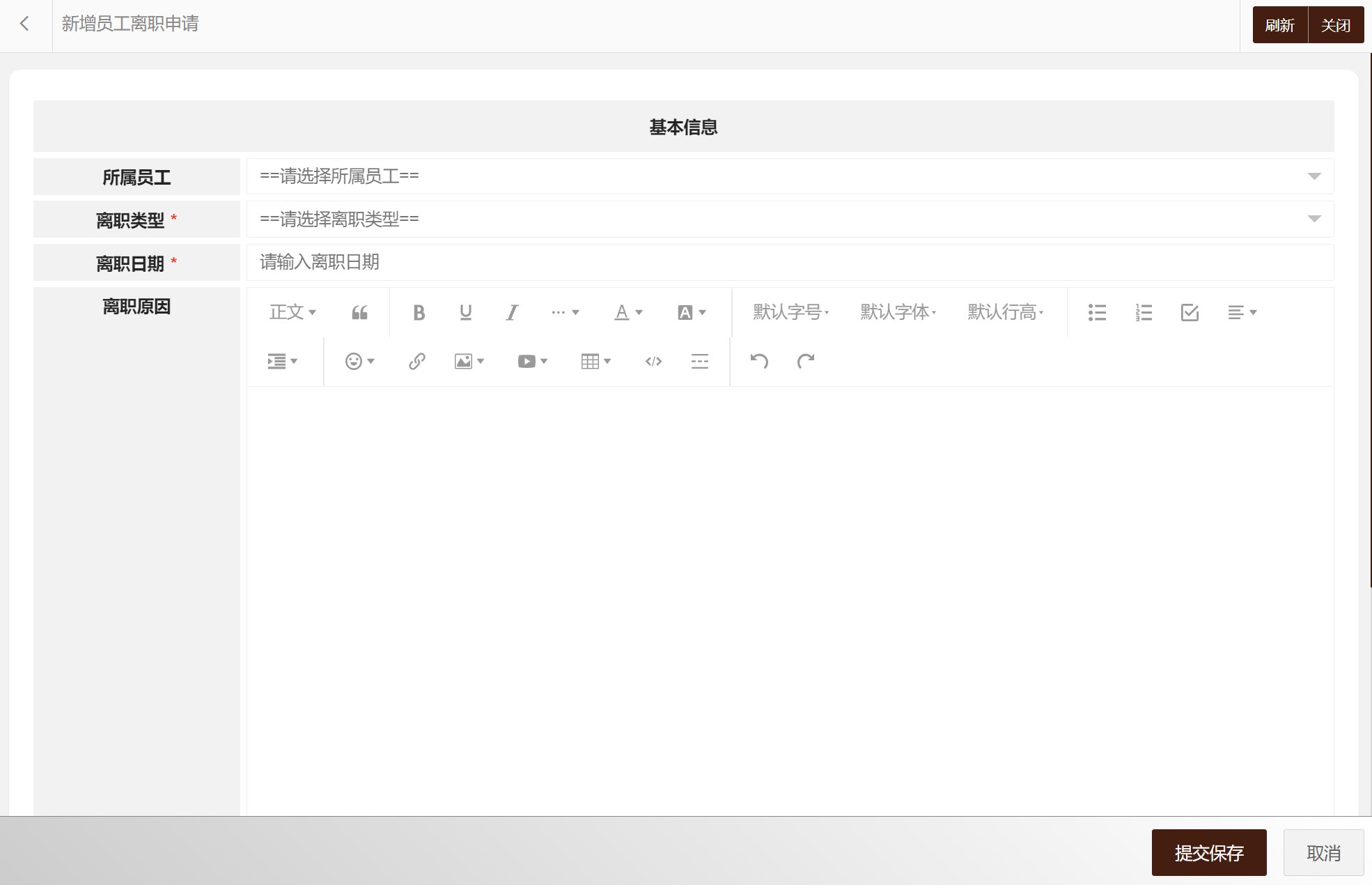在员工离职申请列表中可以选择新增员工离职申请、编辑员工离职申请、删除员工离职申请、搜索员工离职申请等。员工离职申请属性包括:员工离职申请编码、所属员工、离职类型、离职日期、离职原因、交接状态、审批状态等。新增员工离职申请界面如图所示: