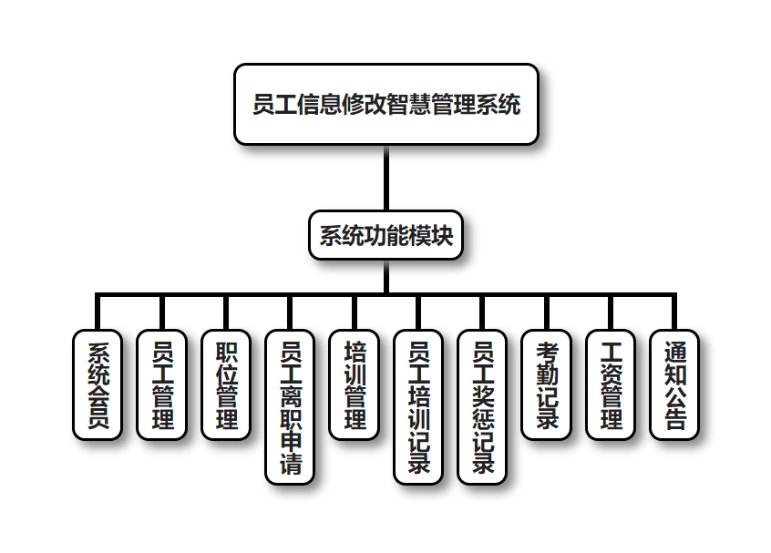 员工信息修改智慧管理系统的主要功能包括:系统会员管理、员工管理、职位管理、员工离职申请管理、培训管理、员工培训记录管理、员工奖惩记录管理、考勤记录管理、工资管理、通知公告管理。