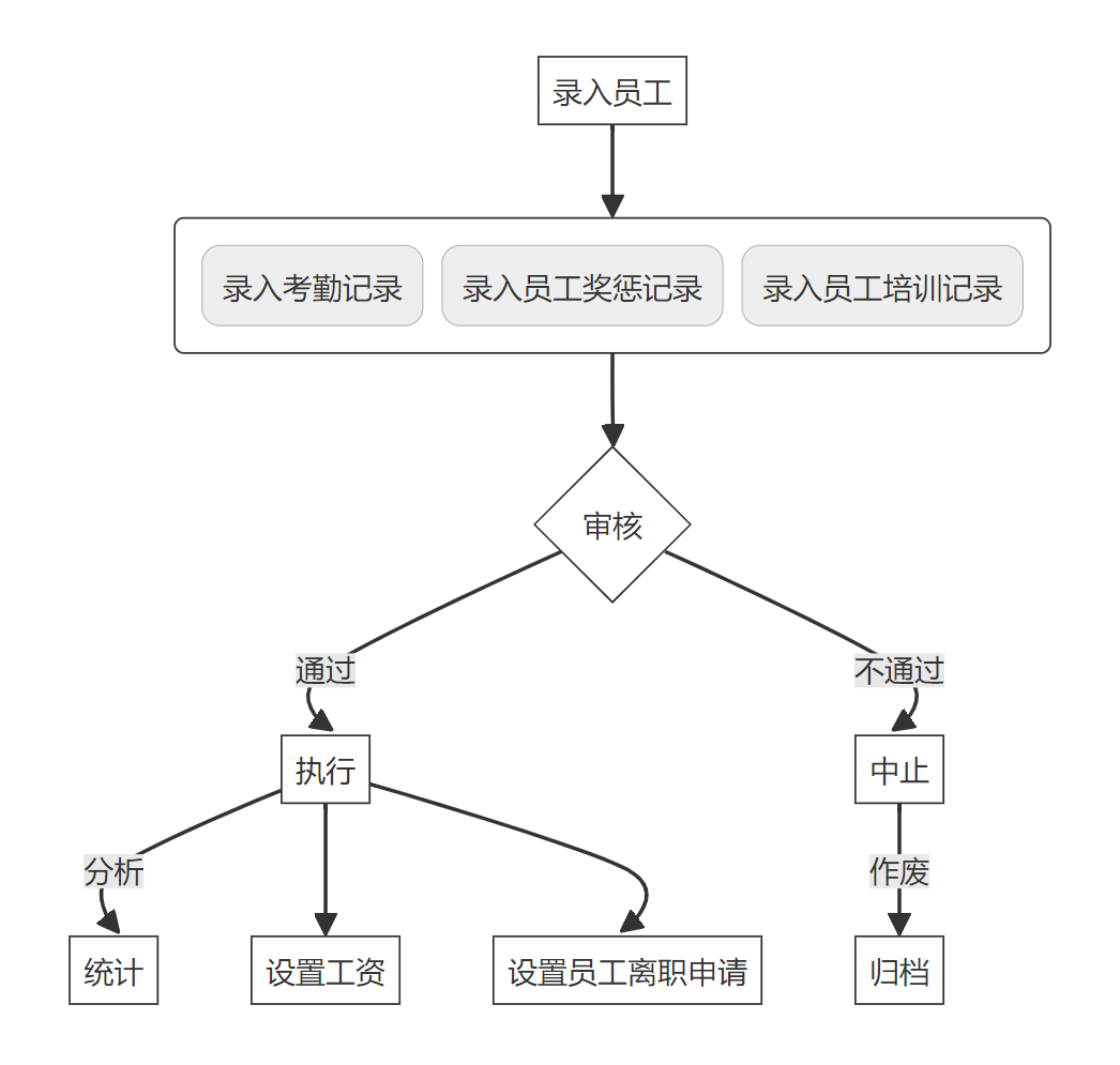 员工管理模块角色用例包括普通员工和部门领导。普通员工负责录入、查阅执行及信息变更,主要功能涉及数据的新增、查询与修改;部门领导则承担审核职责,并能进行数据统计分析。其中,具体操作如下:1. 普通员工可查看所有员工基本信息并根据需要发起信息变更请求;2. 部门领导接收到变更请求后需核验真实性并在确认无误的情况下批准或驳回申请;3. 通过系统提供的数据分析工具进行员工在职时间、绩效评估等统计分析,辅助决策。此模块设计旨在提高工作效率和数据准确性的同时确保信息安全及操作透明度。