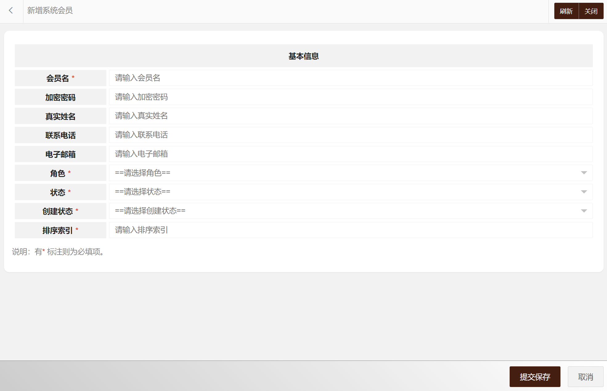 在系统会员列表中可以选择新增系统会员、编辑系统会员、删除系统会员、搜索系统会员等。系统会员属性包括:系统会员编码、会员名、加密密码、真实姓名、联系电话、电子邮箱、角色、状态等。新增系统会员界面如图所示: