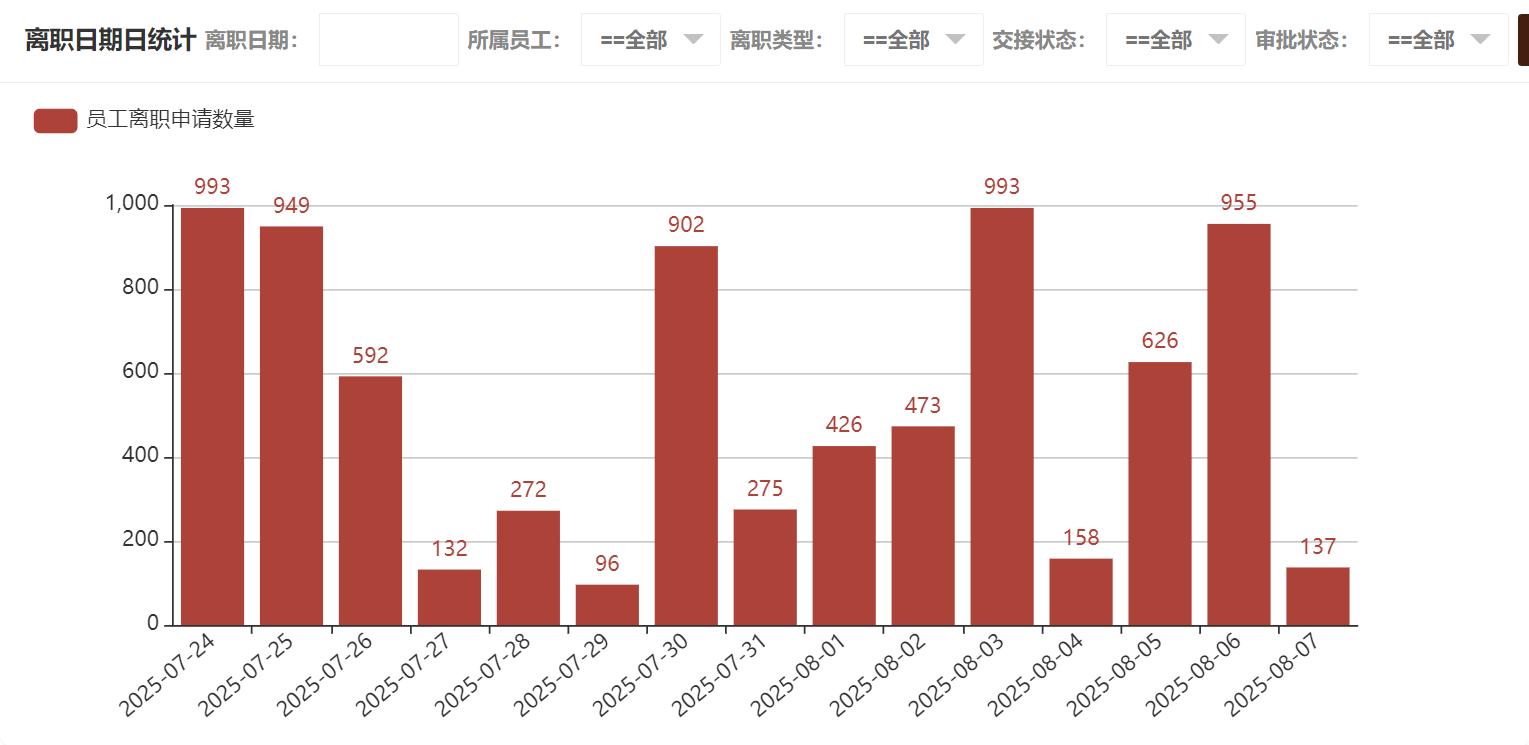 在员工离职申请统计中可以看到所属员工统计、离职类型统计、离职日期年统计、离职日期月统计、离职日期日统计、交接状态统计、审批状态统计,离职日期日统计如图所示: