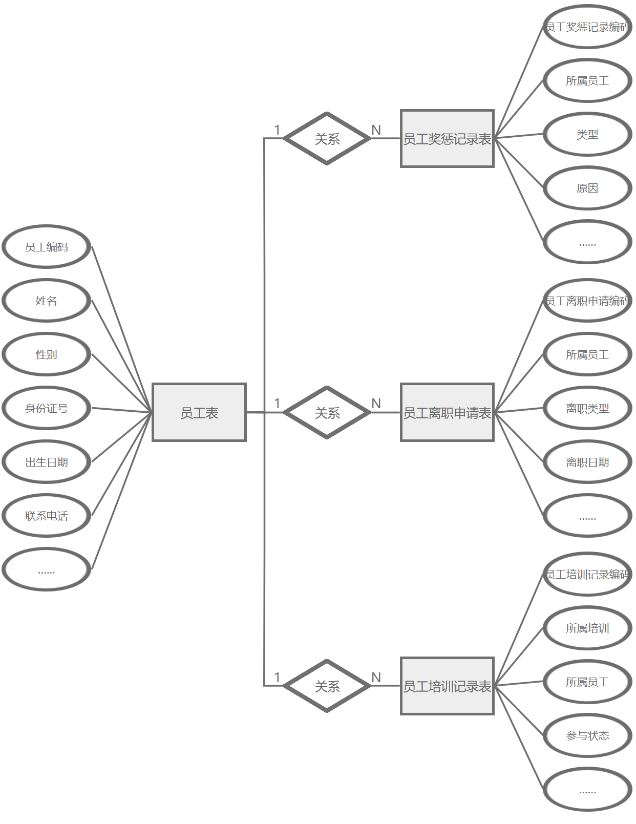 员工管理主要属性包括:员工编码、姓名、性别、身份证号、出生日期、联系电话、电子邮箱、联系地址、所属部门、所属职位、入职日期、试用期天数、在职状态。