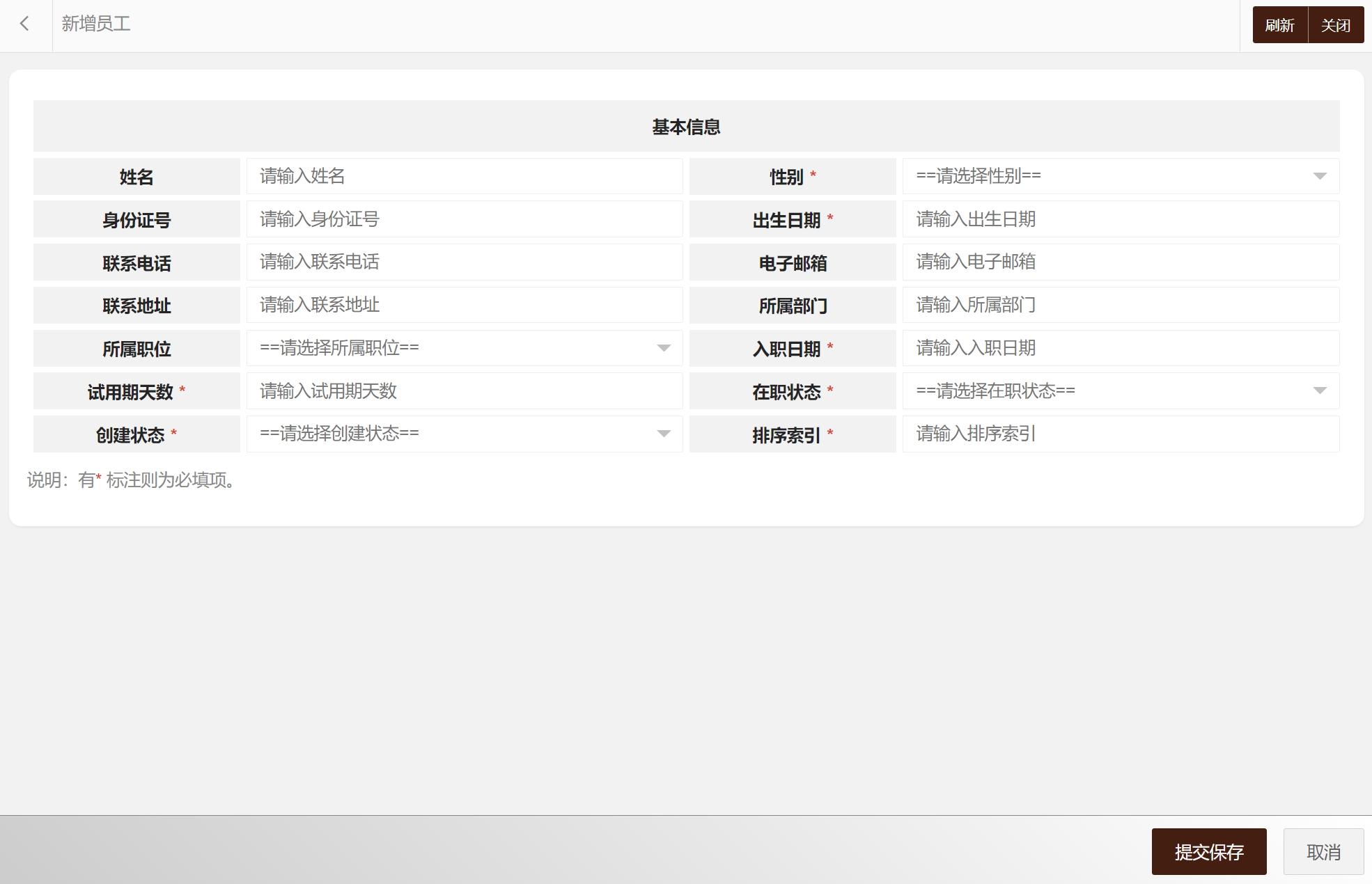 在员工列表中可以选择新增员工、编辑员工、删除员工、搜索员工等。员工属性包括:员工编码、姓名、性别、身份证号、出生日期、联系电话、电子邮箱、联系地址、所属部门、所属职位、入职日期、试用期天数、在职状态等。新增员工界面如图所示: