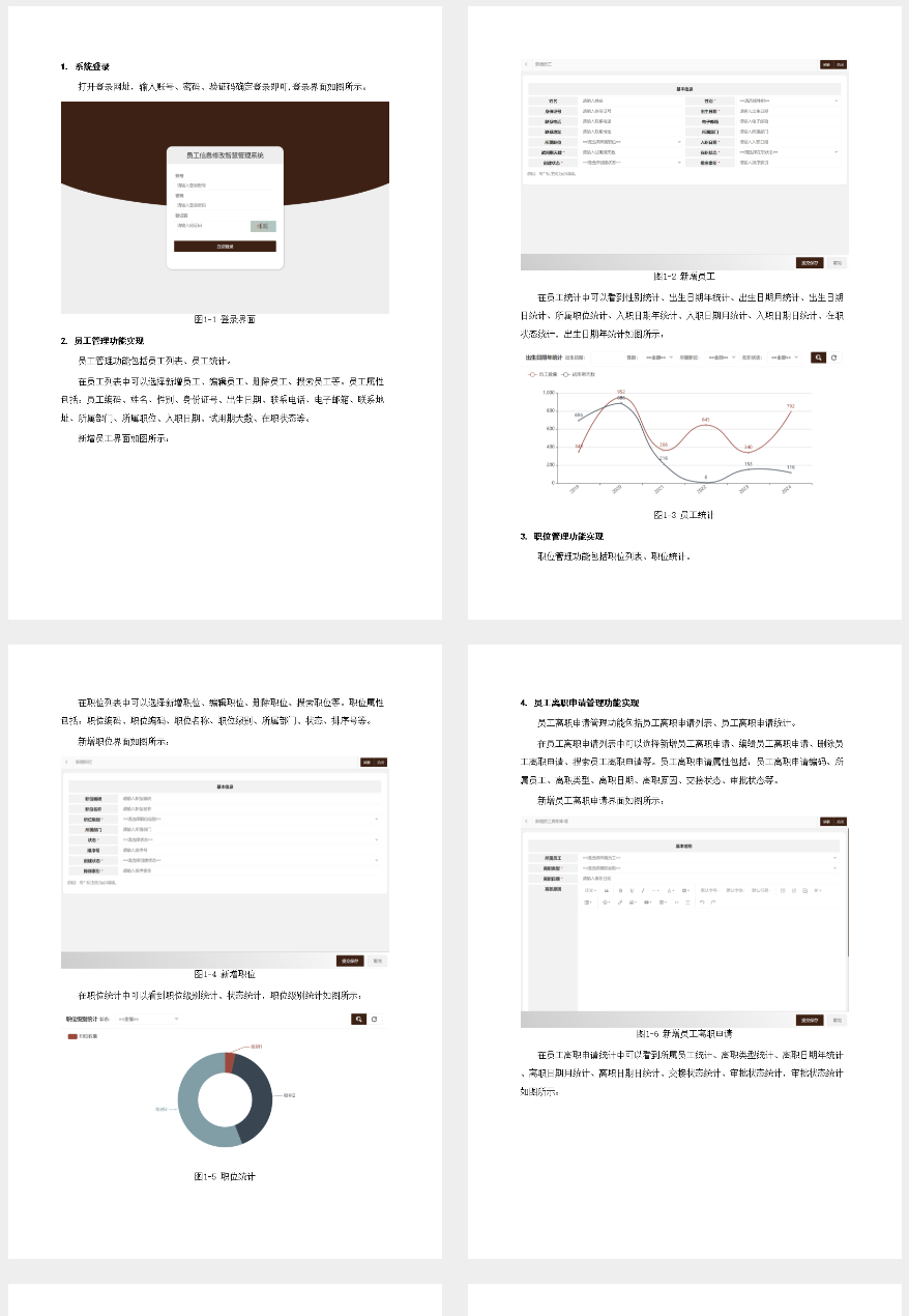 员工管理功能定义包括数据录入、查询、变更和审核。普通员工负责信息更新与维护,输入新员工资料或修正错误;部门领导进行验证确认无误后再提交到数据库中保存。系统提供详细字段校验确保准确性,并支持批量导入导出以提高效率。管理层可通过统计分析报表了解整体人员结构动态变化趋势,如离职率、晋升情况等关键指标,为人力资源决策提供数据支撑。