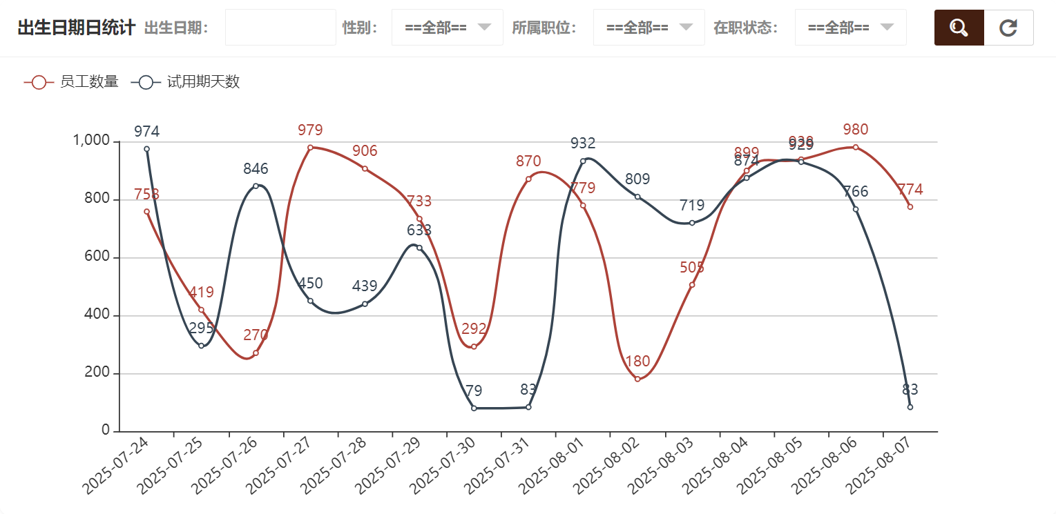 在员工统计中可以看到性别统计、出生日期年统计、出生日期月统计、出生日期日统计、所属职位统计、入职日期年统计、入职日期月统计、入职日期日统计、在职状态统计,出生日期日统计如图所示: