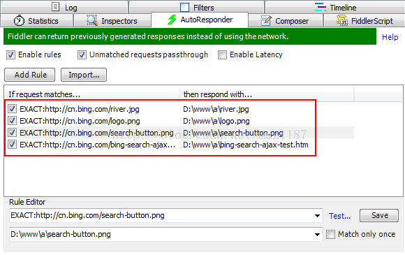 - 将此response替换成我们想要放在服务器上的本地文件bing_search-ajax.htm。选中上一步中的404记录,点开其AutoResponder,勾选如图两个选项,点击add rules;