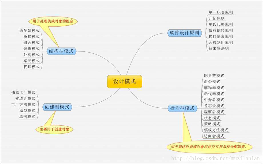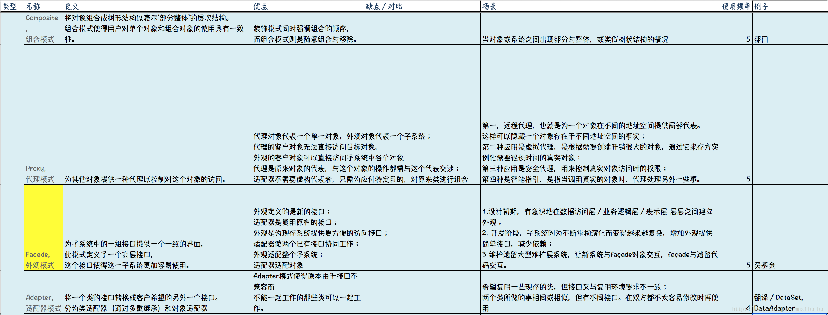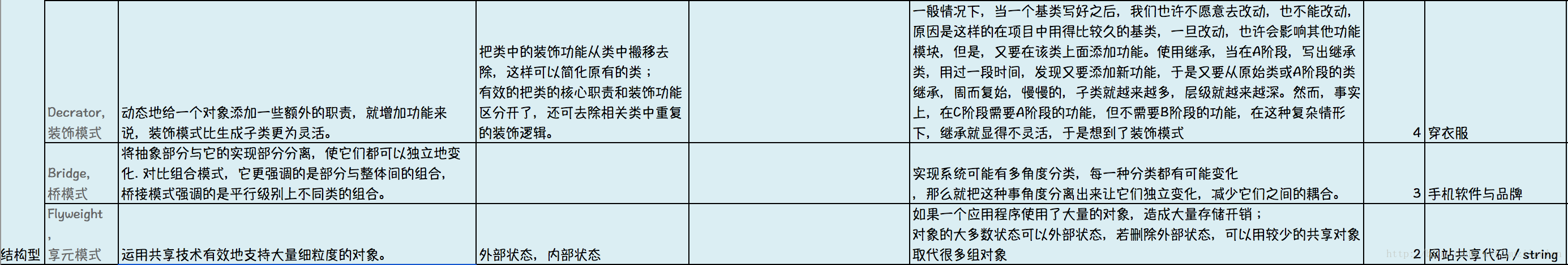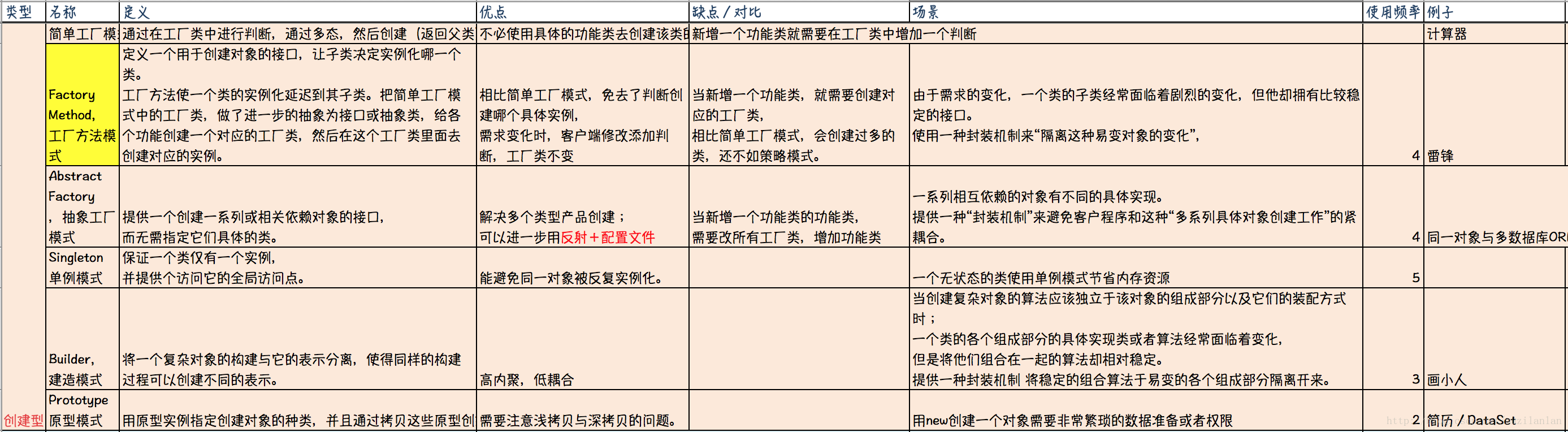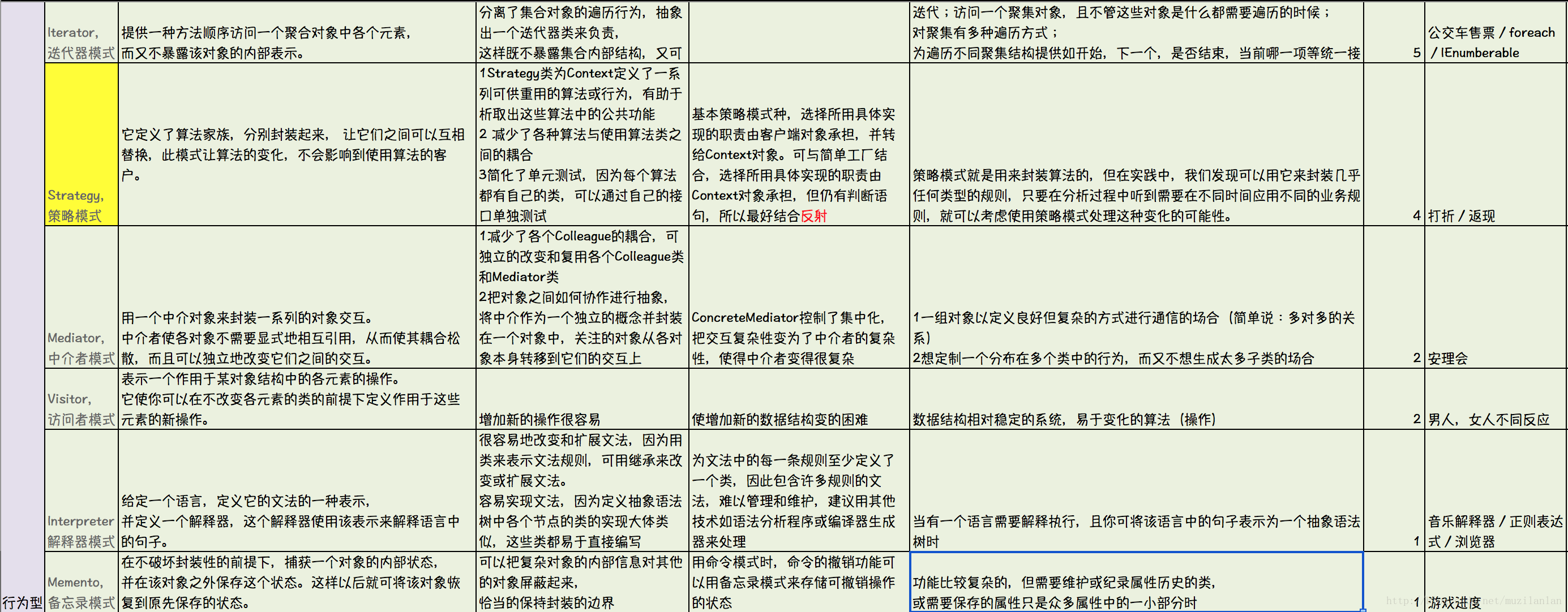 最近看完《大话设计模式》,又结合了一些其他资料,总结成表格。这篇博客里有对应的设计模式的UNML图:http://ce.sysu.edu.cn/hope2008/Education/ShowArticle.asp?ArticleID=8875