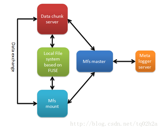 - mfsmout向master获取chunk信息,向mfschunkserver发出读写数据的命令,chunkserver是磁盘IO的执行者。mfsmount是用户发出IO请求的命令接收者,master是mfs所有chunk和node信息的维护者。