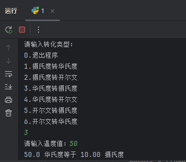 程序思路:输入一个数字选择对应温度转换,并实现对应温度转换,如果输入未包含的数字会直接报错重新输入