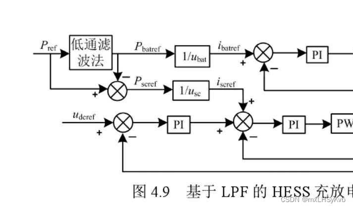 4、混合储能由蓄电池和超级电容构成,通过双向DCDC变换器并入母线,并采用低通滤波器实现功率分配,超级电容响应高频功率分量,蓄电池响应低频功率分量,有限抑制系统中功率波动,且符合储能的各自特性。