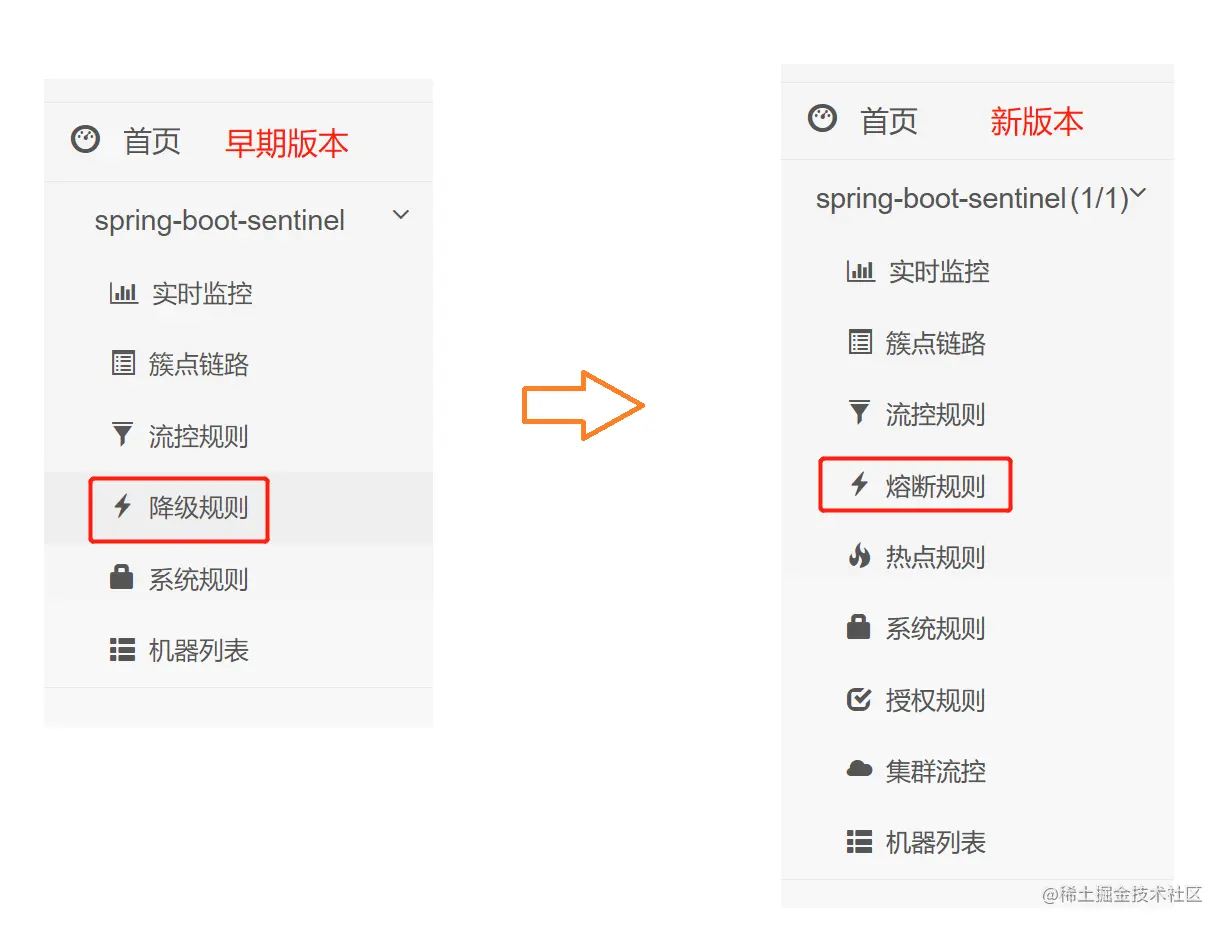当然,某些框架如 Sentinel,它早期在 Dashboard 控制台中可能叫“降级”,但在新版中新版本又叫“熔断”,如下图所示: