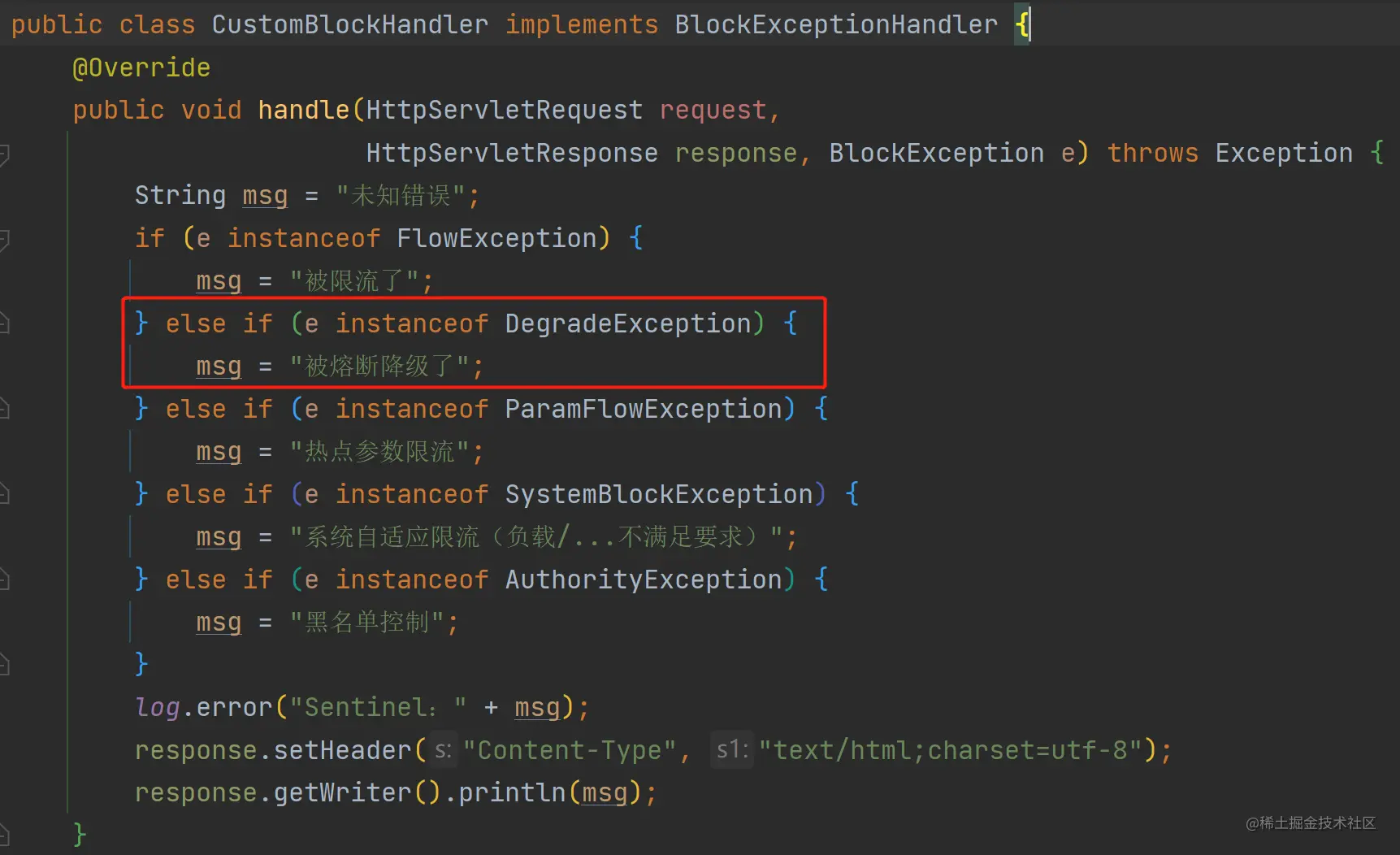 但在两个版本中都是通过同一个异常类型 DegradeException 来监听的,如下代码所示: