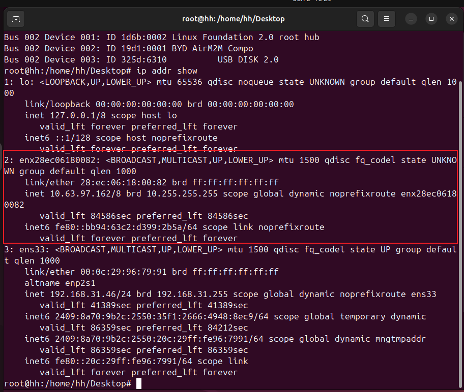 Air8000 是标准的 rndis,目前 linux 大部分发行版本都已经默认支持 RNDIS 驱动了,只要通过 USB 连接 Air8000 工业引擎就可以直接用了,Air8000 工业引擎开机后就会在 linux 设备端看到新的网卡,如下图红框部分为 Air8000 虚拟出的 USB 网卡。