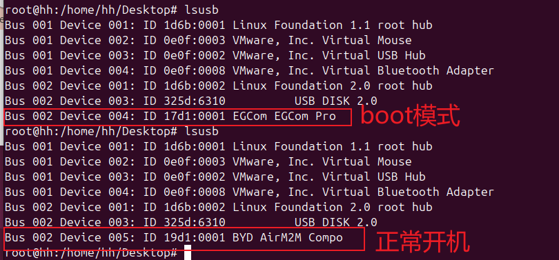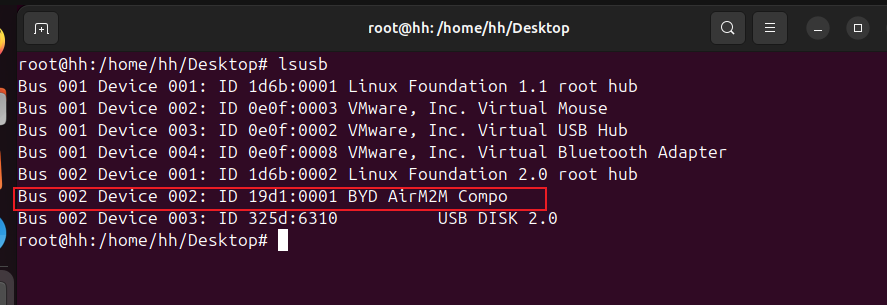 一般 air8000 工业引擎对接的 linux 协议是 USB 协议,设备插入后,系统会检测出设备的标识:PID VID(其中 VID 是厂商识别码 PID 是产品识别码),此处不需要装驱动也可以识别,所以,我们排除插入无法识别的时候,先通过命令行命令 lsusb
