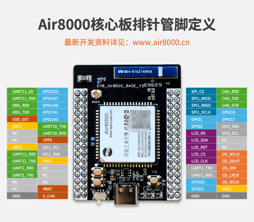 Air8000相关管脚具有复用功能,结合原理图引脚指示可知板载红色LED由PIN24 GPIO21控制。本示例demo中已有配置好的pins_Air8000.json文件,测试demo时一并烧录进Air8000核心板。