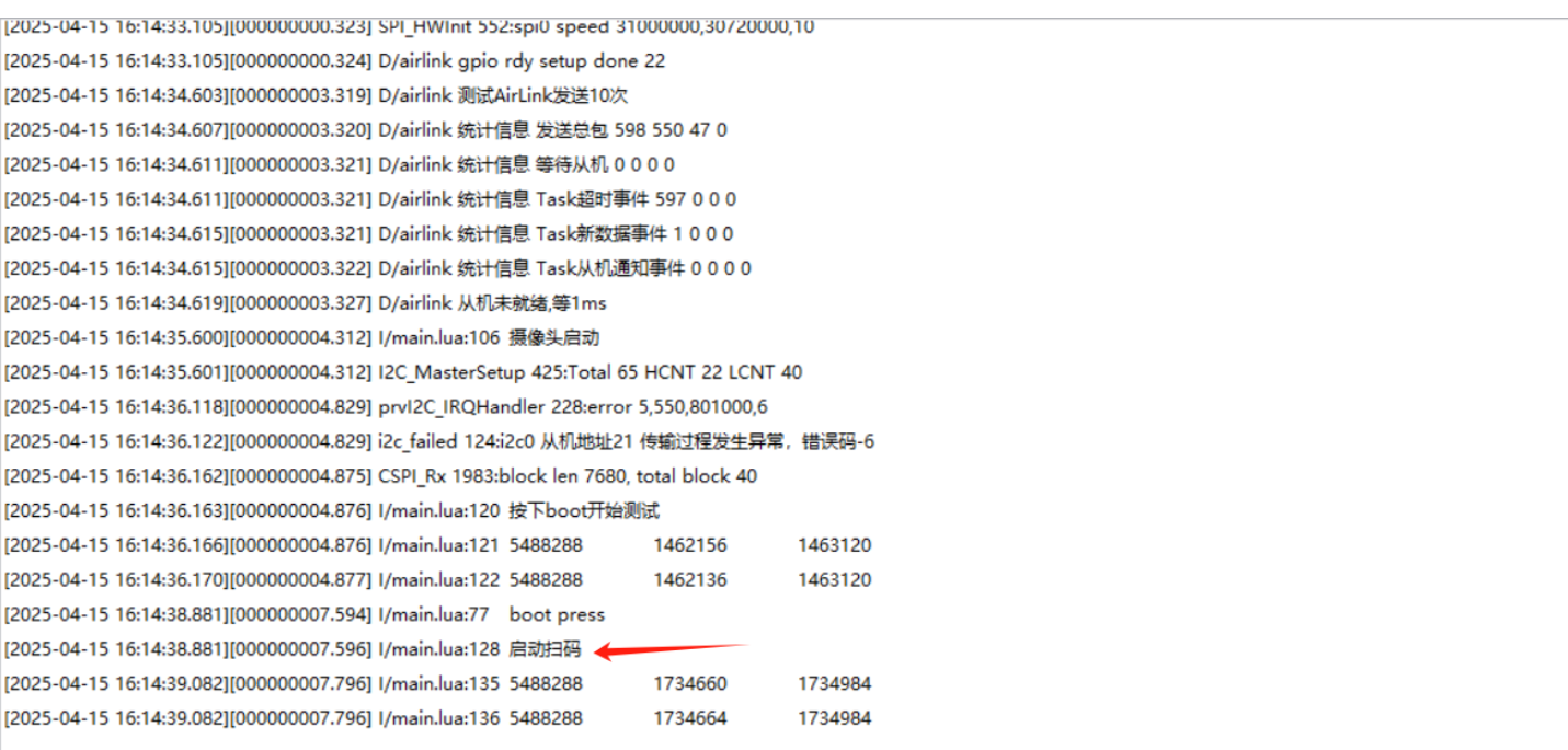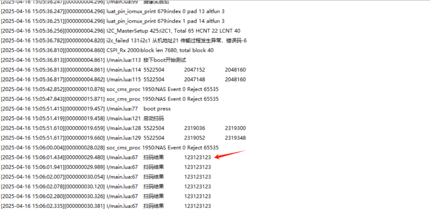 4.1 如果TEST_MODE 设置为1 ,程序运行后,点击boot 键,将进行扫码测试,如果解析二维码或者条形码成功,将会打印在luatools 中。