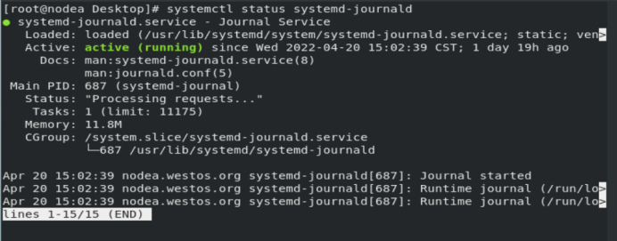 Linux系统中的日志管理 第一处红框内容意为:更改信息采集格式为WESTOS方式,采集信息时只采集主机的ip、时间戳、信息来源程序和信息内容,其他的不采集,并且换行(表示为换行符)的文件,然后设定该目录的拥有组为systemd-journal并且设置权限,完成以上操作后再次重启系统可以看到日志是被保存下来的。这里先清空westos文件并且让别的主机登录这台主机的root用户,然后在westos文件可以看到nodeb登录的信息。0 emerg 系统的严重问题日志(内核报错,一般不会有,若有,系统一般瘫痪)