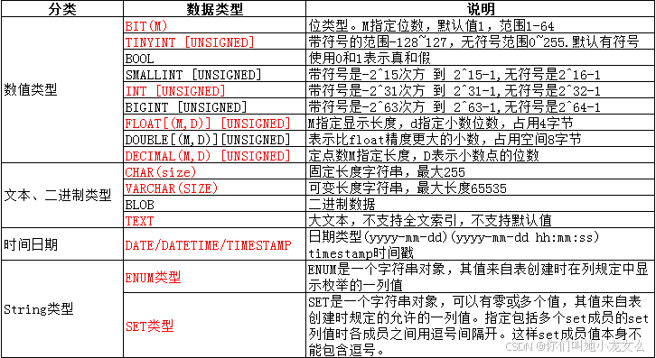 decimal(m, d) unsigned : 定点数m指定长度,d表示小数点的位数