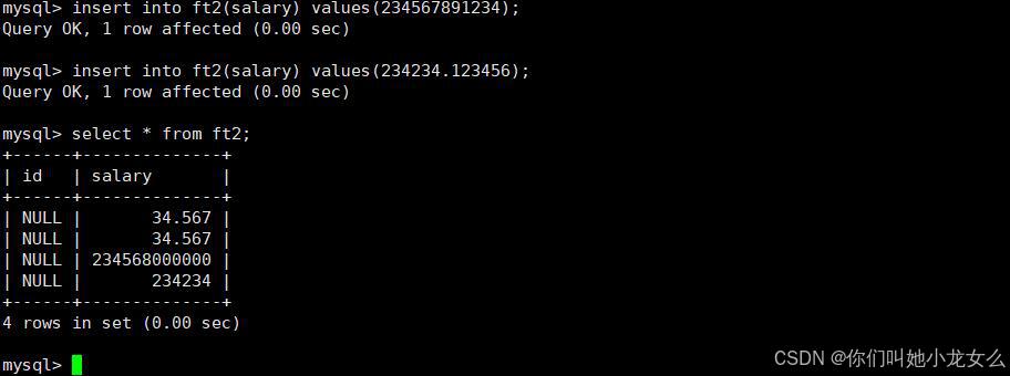 我们插入34.567的时候因为位数较小还可以精确存入,但是当我们插入234567891234时,在进行了一次进位之后把后面的数字都舍去了,在我们插入234234.123456时,小数点后的位数也被全部舍去
