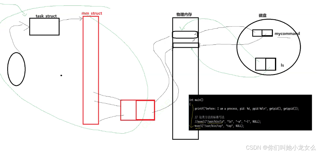 当我们进行进程替换时,即使用替换函数执行ls时,ls会用它的代码和数据替换原本物理内存中的代码和数据,(程序替换并不会创建新的进程),页表及其左侧的部分不变,只需要略微调整。(因为这两部分已经是解耦合了)