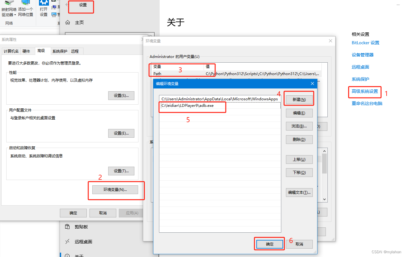 找到雷电按照目录,将 adb.exe 加入到环境变量。右键 我的电脑--属性 -- 关于