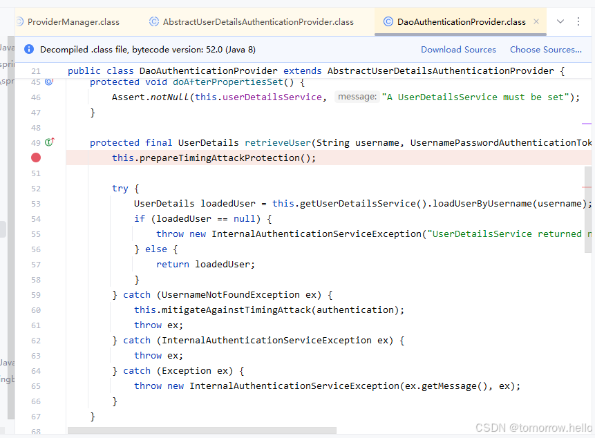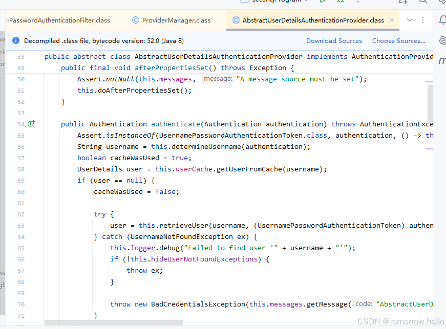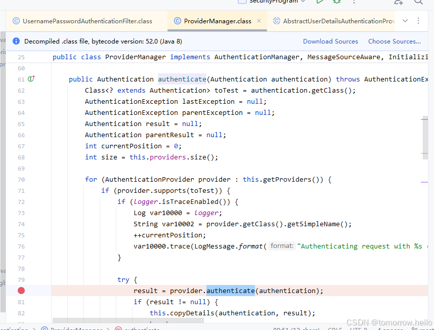- 然后过滤器将Authentication提交至认证管理器(AuthenticationManager)进行认证,它的实现类是ProviderManager,默认ProviderManager使用DaoAuthenticationProvider。