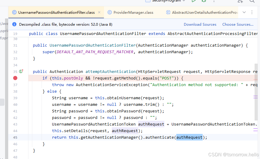 - 用户提交用户名、密码被SecurityFilterChain中的UsernamePasswordAuthenticationFilter 过滤器获取到,封装为请求Authentication,通常情况下是UsernamePasswordAuthenticationToken这个实现类。