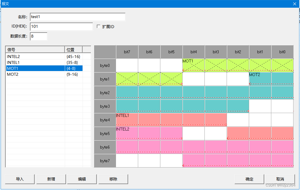 信号的高位在高字节的高位,信号的低位在低字节的低位,如图的INTEL1,箭头由低位指向高位。