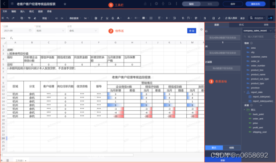 在使用门槛方面,对于专业数据分析人员或熟练使用Excel的工作者,Quick BI在线电子表格沿用了类似于Excel在线设计器的交互方式,因此上手难度不高,基本上算是“平滑过渡”。 它的主界面主要分为工具栏、创作区和数据面板三大功能区,工具栏中包含设置、编辑、格式、数据、查看、查询等常规控件,创作区可按照单元格展示和引用数据,完成数据的再加工,数据面板则将每个数据集的数据类型分别列在维度和度量的列表中,方便选择与切换。此外,Quick BI在线电子表格还具有强大的函数功能,包括数据库函数、工程函数、财务函数等,方便不同专业领域的人员使用。
