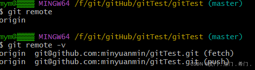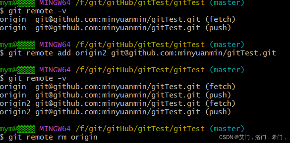 git remote -v git remote add origin2 git@github.com:minyuanmin/gitTest.git git remote -v git remote rm origin git remote -v -