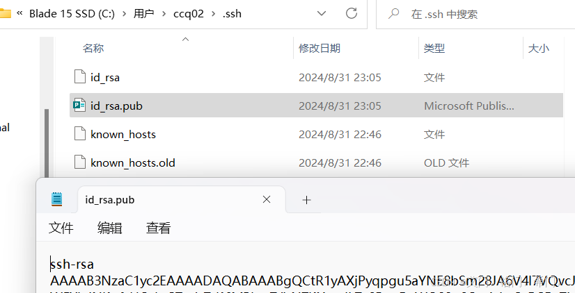 - 找到下面这一行并进入目录下记事本打开.ssh/id_rsa.pub文件