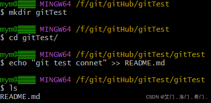 mkdir gitTest cd gitTest/ echo "git test connect" >> README.md ls