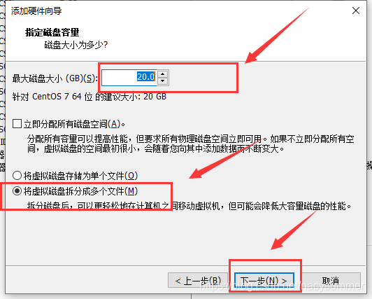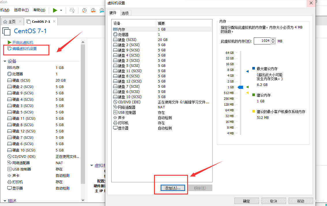 首先我们需要为虚拟机增加几块硬盘,下图是步骤,按照图中的标示进行操作