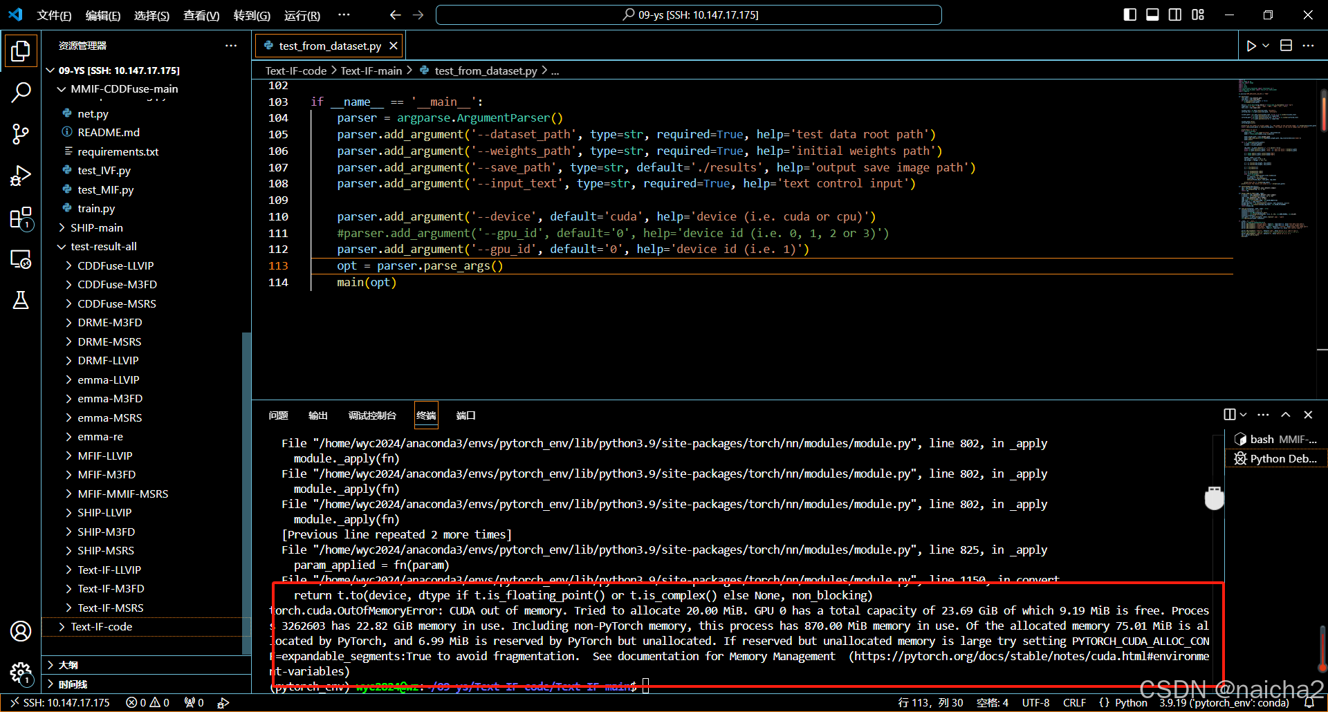 解决:首先看一下服务器显卡有没有空闲,命令如下:nvidia-smi,如果有空闲,则可以改代码,一口气用几张跑,如下:注释掉的是之前的代码,113行是更改之后的。并且跑代码的python test.py 后面加参数:gpu_id 1 2 3,故要这样:python test.py gpu_id 1 2 3