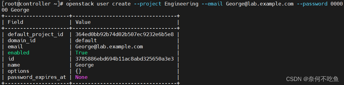 openstack user create --project Engineering --email George@lab.example.com --password 000000 George