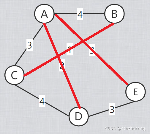 (B, C), (A, C), (A, D), (E, D) 均为「横切边」,其中BC一定属于最小生成树。