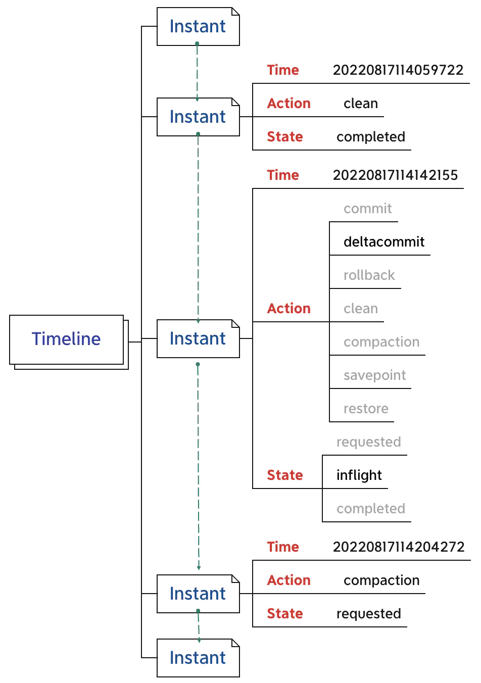 每张Hudi表都有一条Timeline,由许多Instant组成,其中维护了各个时间点在该表上进行的操作。每个Instant又包含以下3个主要field。