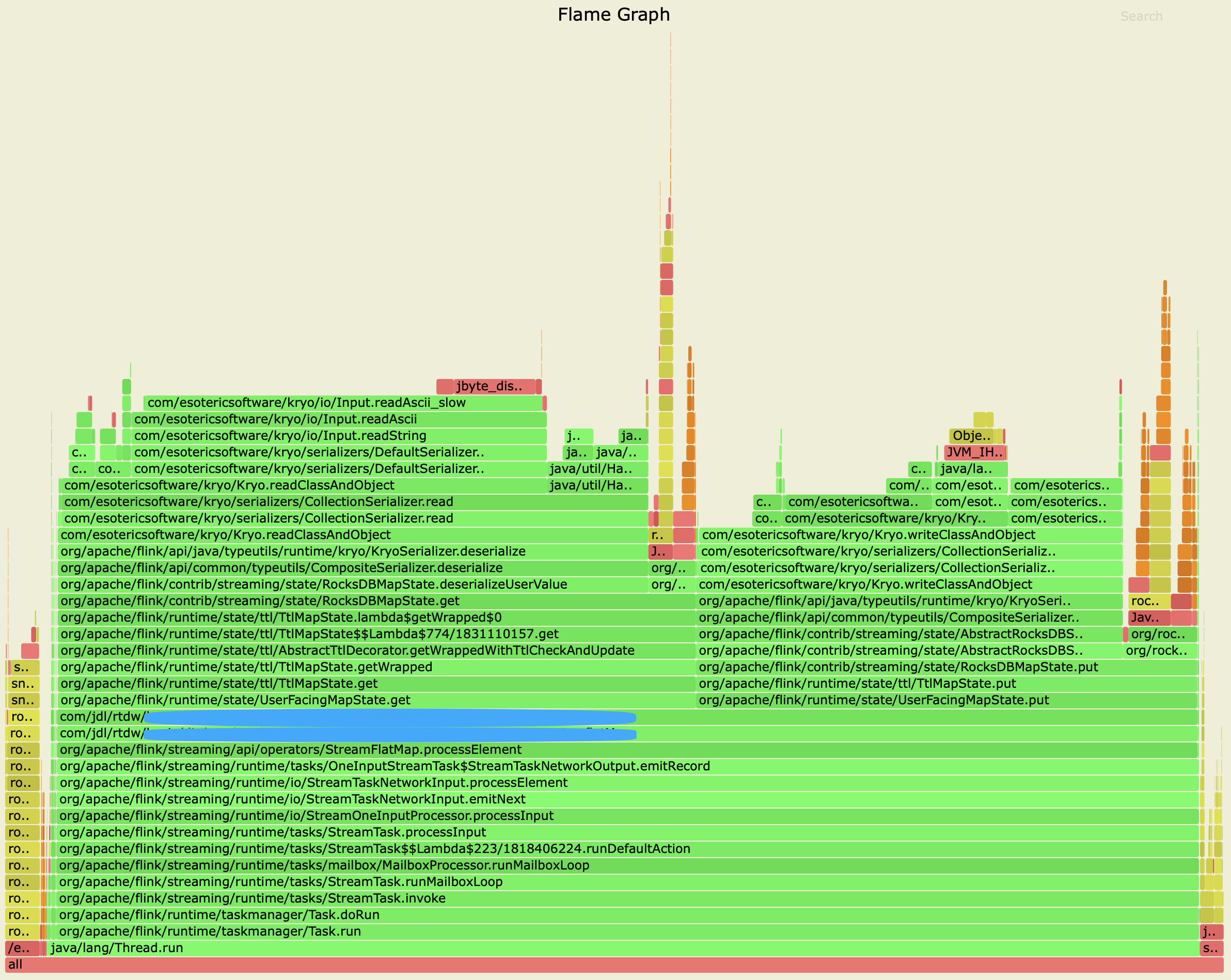 经过持续观察,存在倾斜的sub-task数据量最多只比其他sub-task多出10%~15%,按照常理不应引起如此严重的性能问题。遂找到对应的TaskManager pod打印火焰图,结果如下。