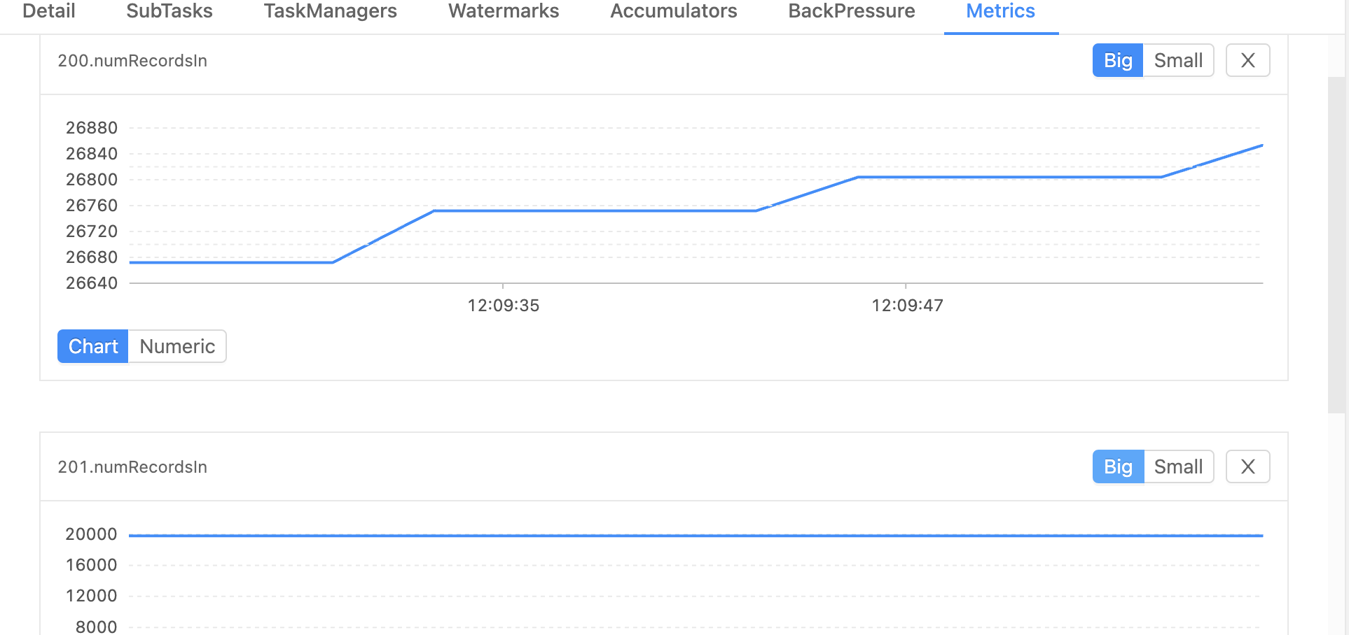 通过Flink Web UI定位到问题点位于拓扑中倒数第二个算子,部分sub-task checkpoint总是过不去。观察Metrics面板,发现有少量数据倾斜,而上下游反压度量值全部为0。