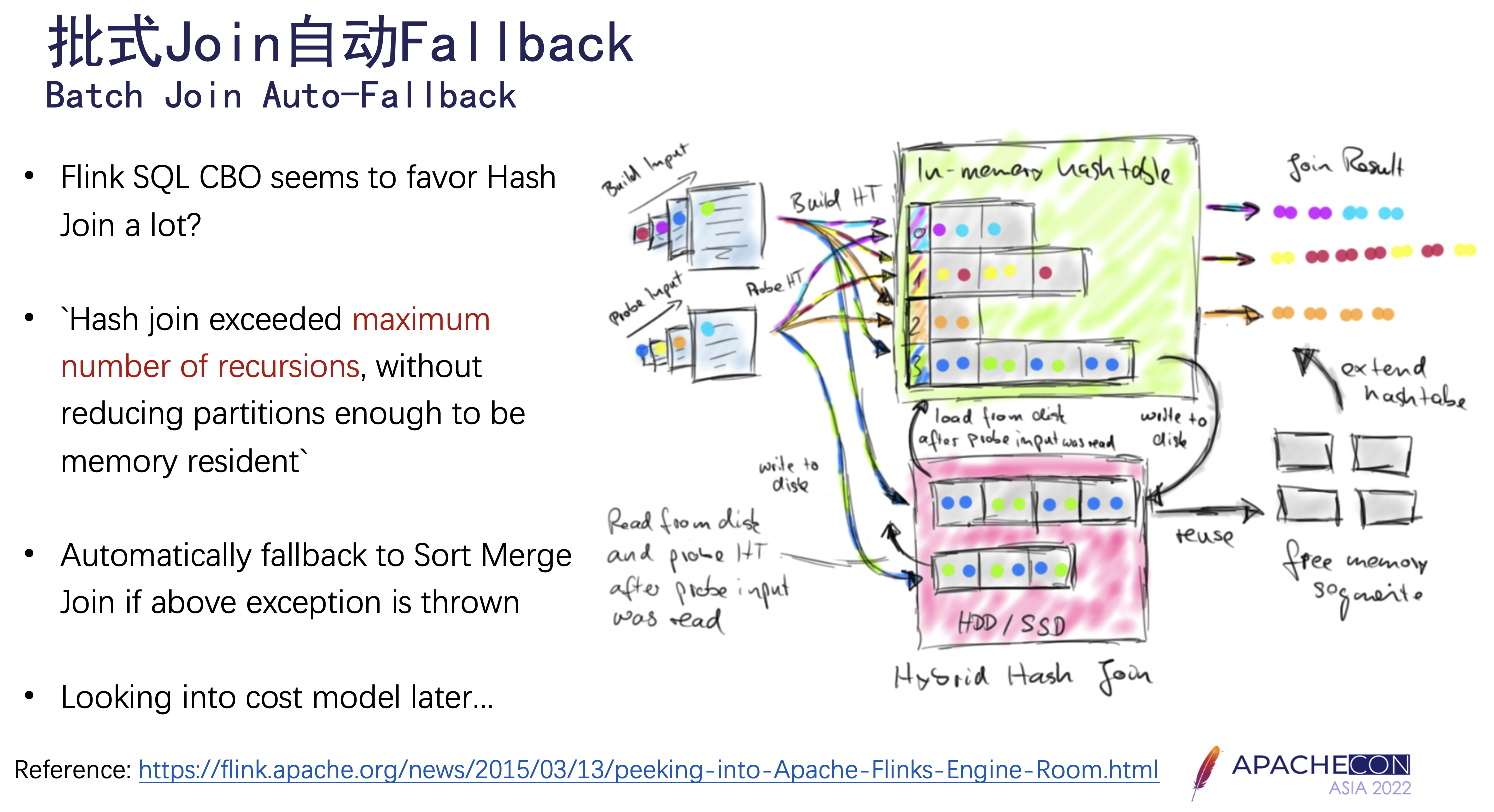 笔者在今年7月ApacheCon Asia 2022流处理专场的分享内容里谈到了这个问题,并且将其归咎于Flink SQL的CBO优化器的代价模型不太科学,导致其十分偏向选择Hash Join。由于修改的难度很大,所以暂时的workaround就是在任务失败后,自动设置table.exec.disabled-operators参数来禁用掉ShuffleHashJoin算子,从而强制使用Sort-Merge Join。