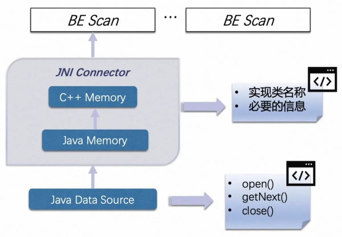 可见,JNI Connector在Java一侧提供了统一的规约,接入方实现open() / getNext() / close()三个方法(均位于ConnectorScanner抽象类下),并提供必要的信息(如数据类型等),就可以将数据读出。在JNI Connector内部,会把要处理的数据写入C++能识别到的native memory区域(对于Java来说则是堆外内存)。BE侧通过读取这部分内存进行Scan操作。ConnectorScanner抽象类的代码如下。