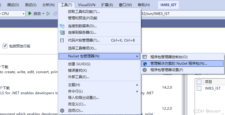 点击导航栏中工具 => NuGet包管理 => 管理解决方案的NuGet程序包