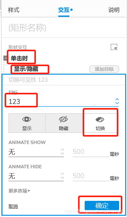 六、选择“单击时”-“显示/隐藏”-“目标”-“切换”-“确定”。